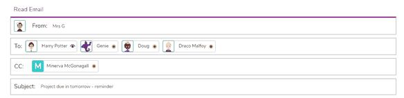 | 2. | TO: This is used to choose recipients from the Address Book. Emails can be sent to multiple recipients. To fill it, either select the Contacts icon which will open the address book screen allowing recipients to be chosen from the full list of contacts, or start typing the name of someone in the Address Book and select from the list of suggestions. Recipients will appear underneath this field, and can be removed by clicking the "X" to the right of the name. Teachers have the option to choose contacts from the whole school, specific classes, or Practice Users. |