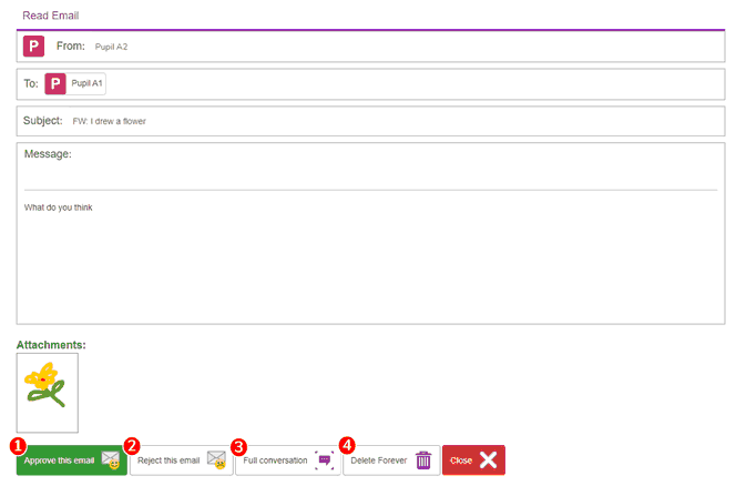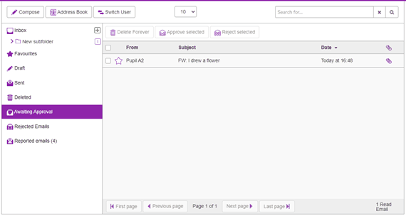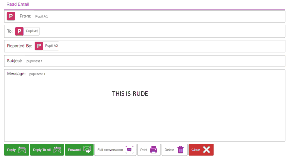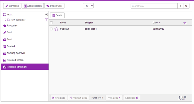If the Email Settings allow children to email each other and are set not to require approval before being sent, children who receive mails that they believe are inappropriate, can use the Report to Teacher button. This will remove the email from all their folder and notify the teacher via their Reported emails folder. Teachers are also alerted of a reported email to their linked email address which adds another layer of safeguarding.