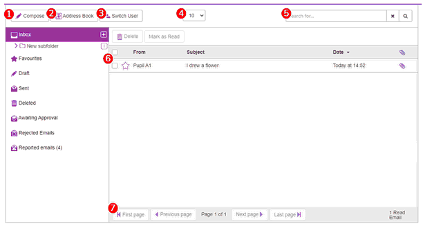 Whilst in Teacher Mode, the In-box will show emails sent to the teacher from fellow teachers, children, and the Purple Mash Practice Users. From here, compose new emails, save emails to Favourites and approve or reject emails that children have sent, if approval has been enabled in settings.