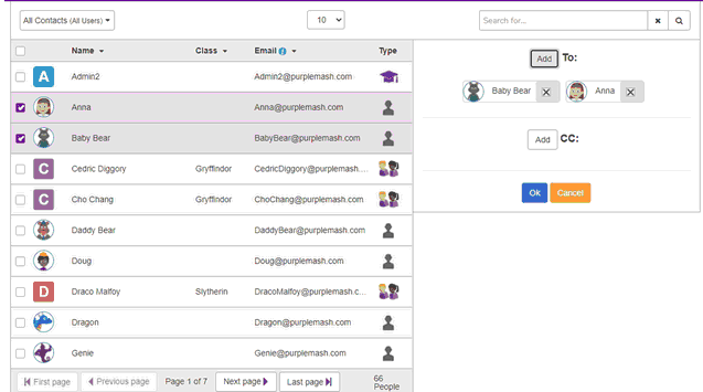 Find the desired contact in the address book, tick the box to the left of their name and then use the Add button to add them to "To" field. Select multiple contacts by ticking more than one, or tick the "Select All" box to select everyone in a class or group. Pressing the "x" next to a contact's name will remove the contact from the "To" field. Press OK to add the email. Pressing Cancel will discard any changes made to the "To" or "CC" fields.