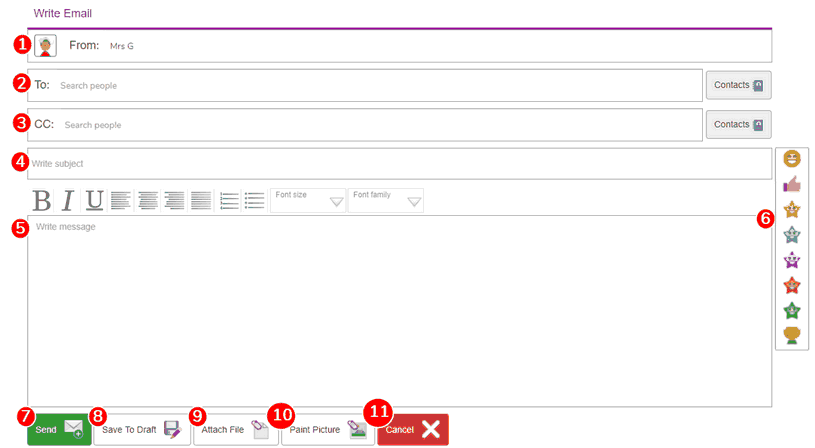 | 5. | WRITE MESSAGE: This field can contain words, letters, symbols, and Purple Mash emoticons. |